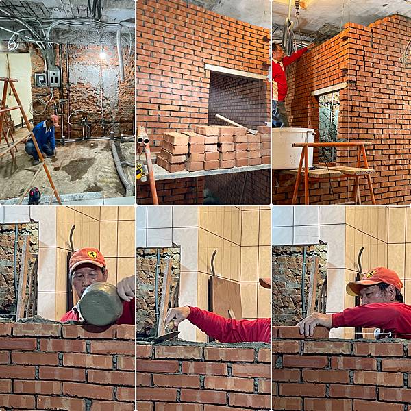 疊磚師傅:早期的泥作師傅都是十八般武藝,現今已逐步走向每個工段的專精化。 雷射放樣、拉基準線。4吋紅磚隔間牆京鼎室內設計、裝潢設計