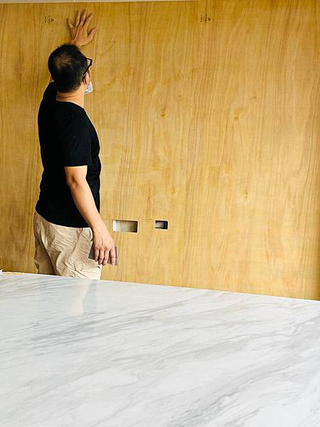 #電視牆 #密接方式師傅都會很怕怕 #樂維希臘白石 #透心美耐板 *上膠完成,等乾到一定程度後,師傅才會開始黏貼。
