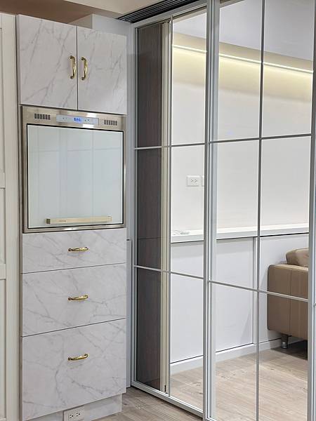 廚房裝修:淺色系磁磚、優白烤玻、樂天人造石檯面、美杉天花板。