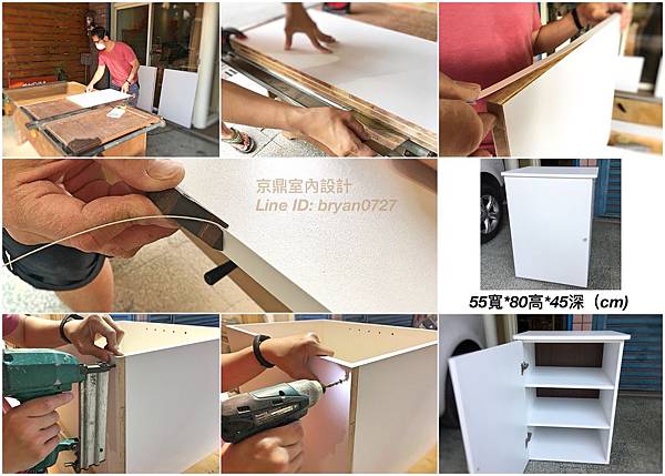 *一個櫃子的誕生是需要很多步驟:裁板、封邊、埋層板固定孔、櫃檯組裝、挖鉸鏈孔、桌板倒圓角、門板組裝。