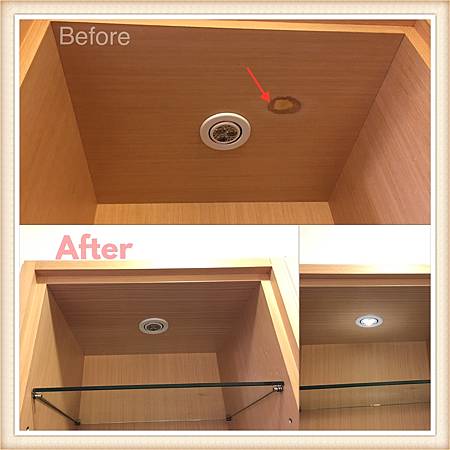 以下是第三個實際案例分享: 木作貼皮玻璃展示櫃,因為業主不小心將上方的皮板燒了一個痕跡,客人傳了照片告知需求,