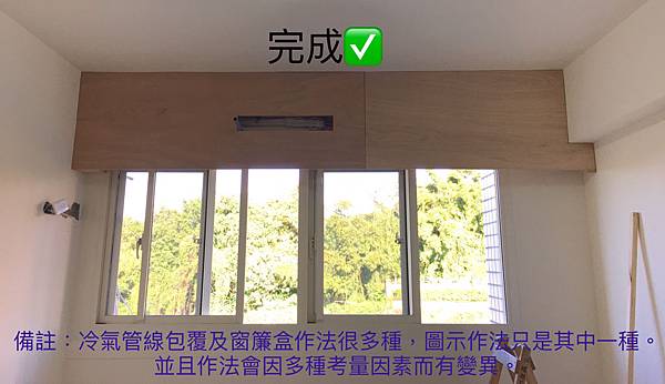 *冷氣管線包覆及窗簾盒作法很多種,圖示中僅是其中之一。而且作法也會因多種考量因素而變異。